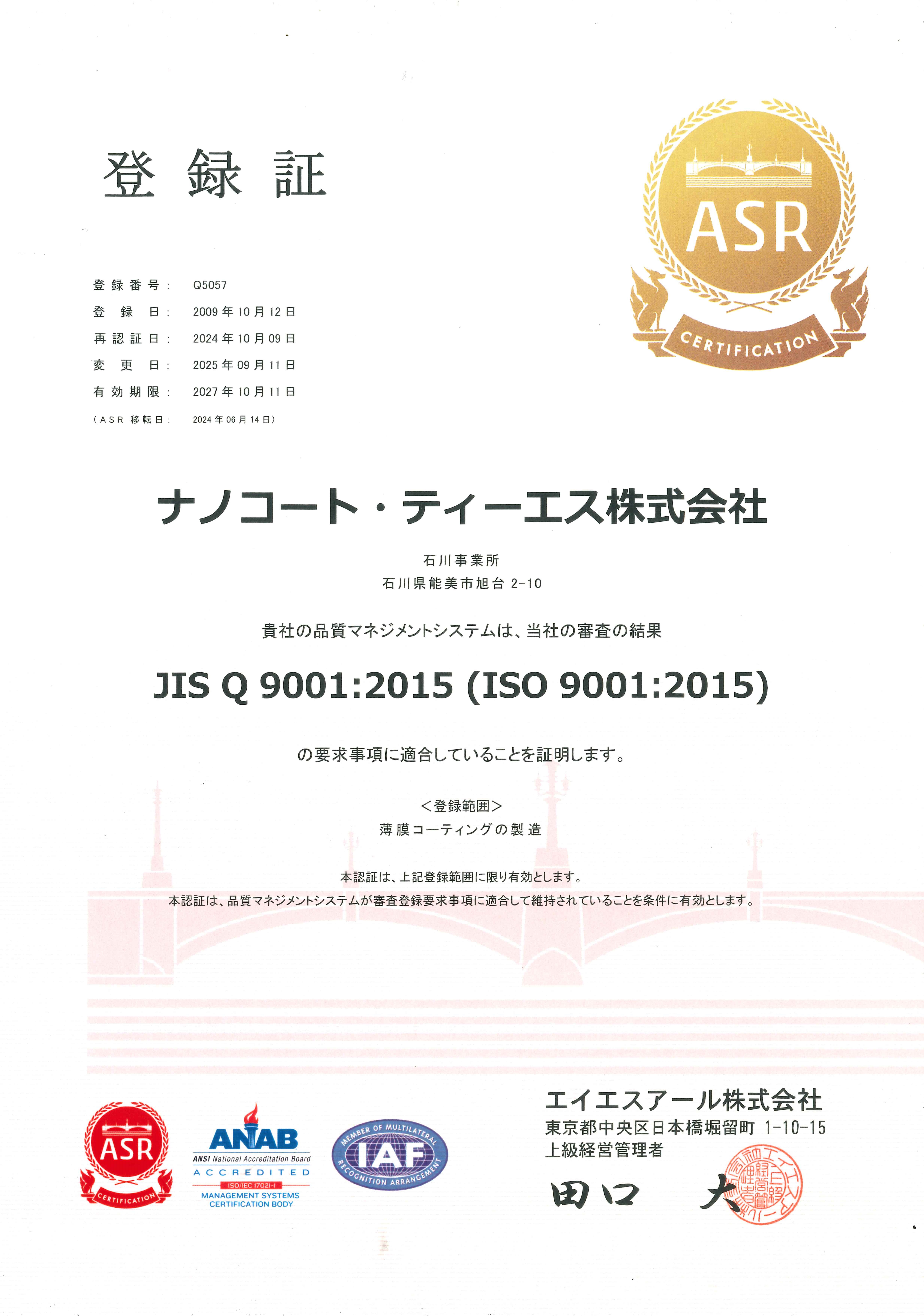 ナノコート・ティーエス(株) 石川事業所は、品質マネジメントシステム ISO9001:2015に基づき、次の品質方針を策定し品質システムを構築維持します。