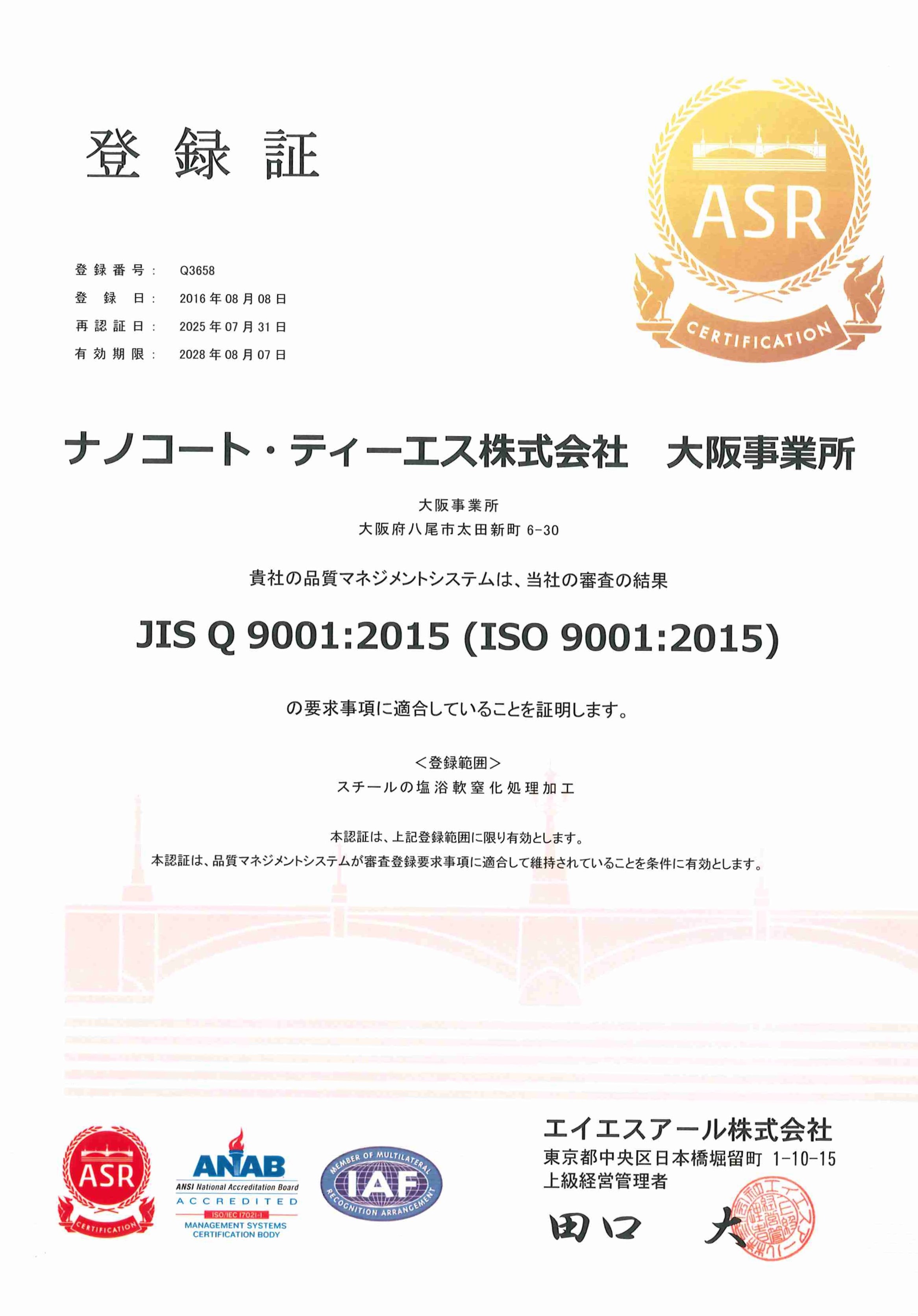 ナノコート・ティーエス(株) 大阪事業所は、品質マネジメントシステム ISO9001:2015に基づき、次の品質方針を策定し品質システムを構築維持します。